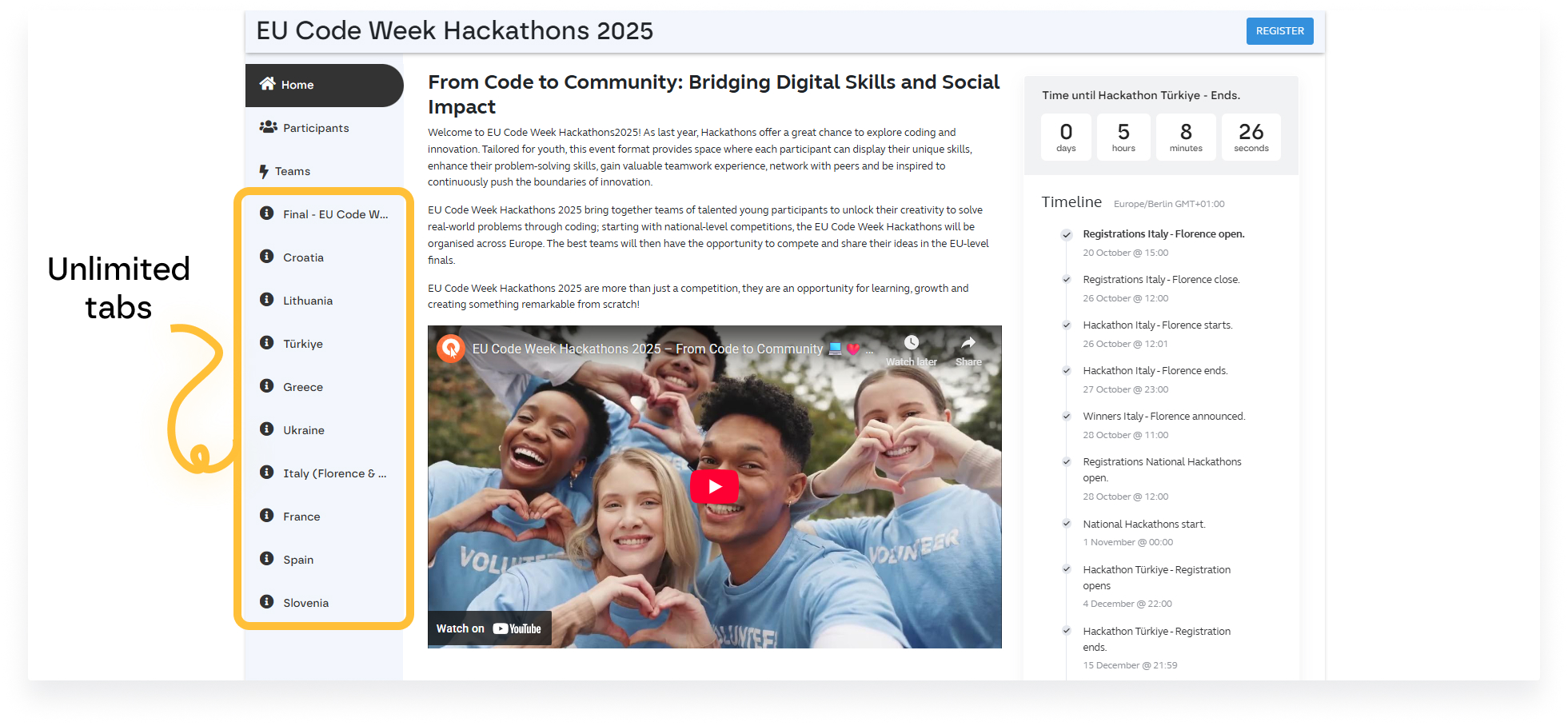 Each country hackathon had its own dedicated tab, hosting local-specific content, tailored to local needs, while maintaining a consistent look and feel aligned with the overall program.